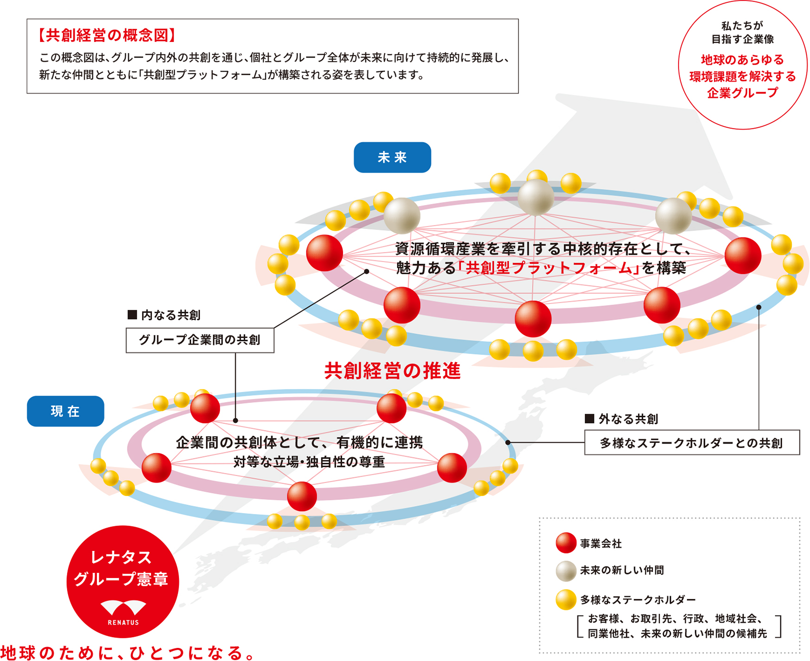 そのプラットフォームに、志をともにする新たな仲間が集い、輪を広げながら、地球のあらゆる環境課題を解決する企業グループを目指し、豊かな未来を共に創ります。