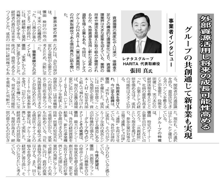 2026年4月20日発行の『週刊循環経済新聞』に、当社のグループ会社である株式会社HARITAの代表取締役社長・張田真の単独インタビュー記事が掲載されましたので、お知らせいたします。 ※画像をクリックすると記事詳細PDFがご覧いただけます。 出典:循環経済新聞2026年4月20日号 ※上記の記事は、発行元から許可を得て掲載しています。無断の二次利用はお控えください。