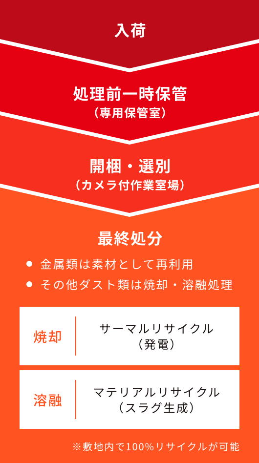 増え続けるICT機器の不用品や廃棄物について、金属類や再利用可能なものをできる限り回収し、再資源化しています。パソコンや通信機器の記憶媒体はディスクに直接穴をあける、または破砕機にかけるなど物理的機能破壊を行うことで確実なデータ消去を実施しています。また、厳重にセキュリティが保たれた機密物品専用の保管室を導入しているため、情報記録媒体等の廃棄物の中でもより高いセキュリティが必要となる物品にご活用いただけます。