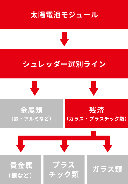 太陽電池モジュールは、FIT(再生可能エネルギー固定価格買取制度)により急速に普及が進んでいるため、現在の設備導入のスピードに比例して、今後は廃棄量も加速度的に増加すると想定されています。私たちは、パワーコンディショナーや蓄電池、電線など、太陽光発電システム周辺機器の効率的な処理方法を確立しており、これらの廃棄物からガラス類、プラスチック類、貴金属などの様々な有価物を選別し、再資源化することが可能です。